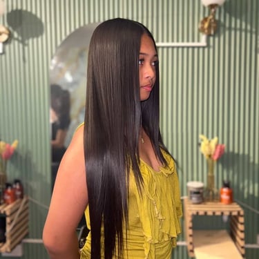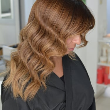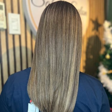 A smiling woman with shiny, styled hair sitting in a cozy salon chair.